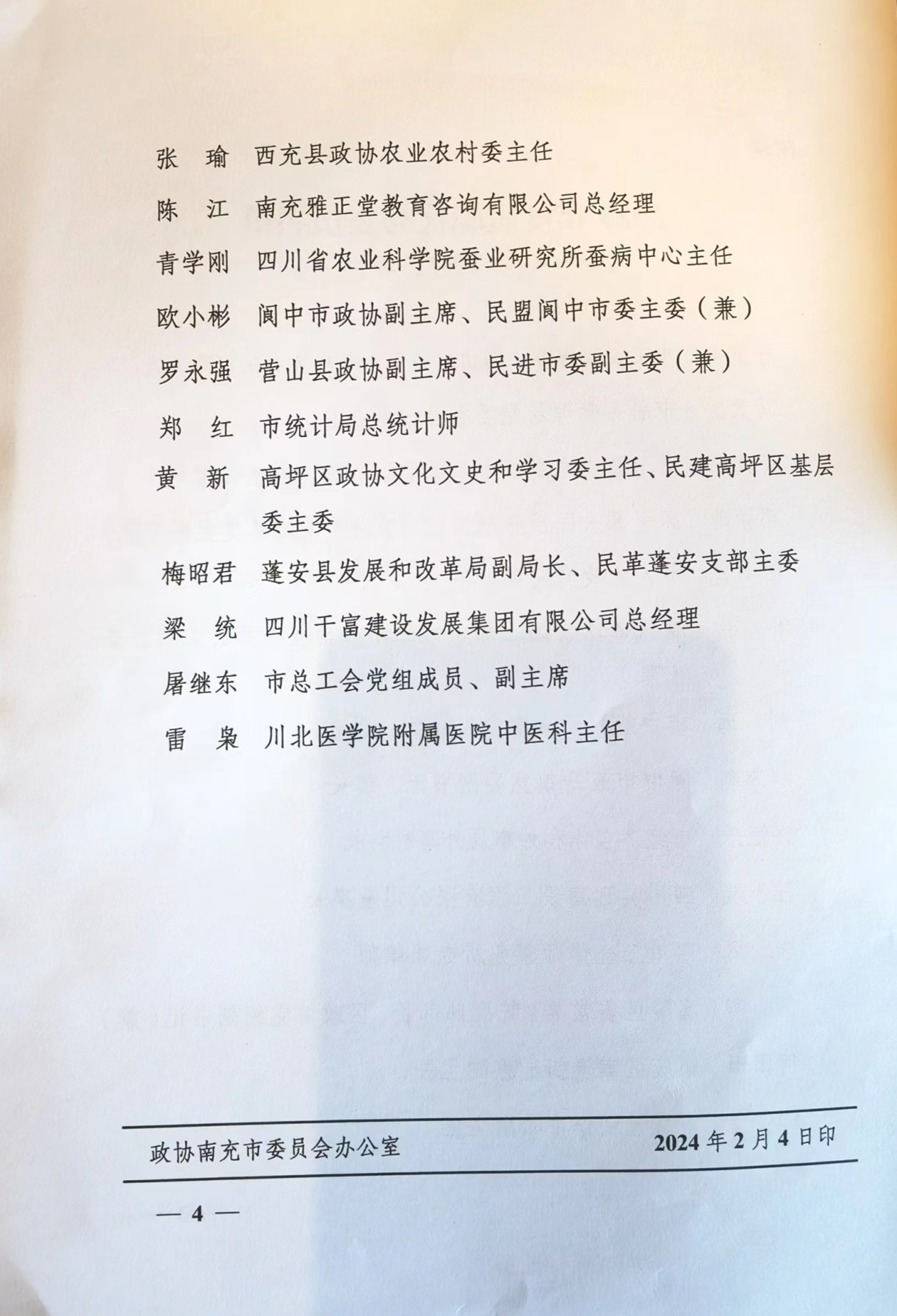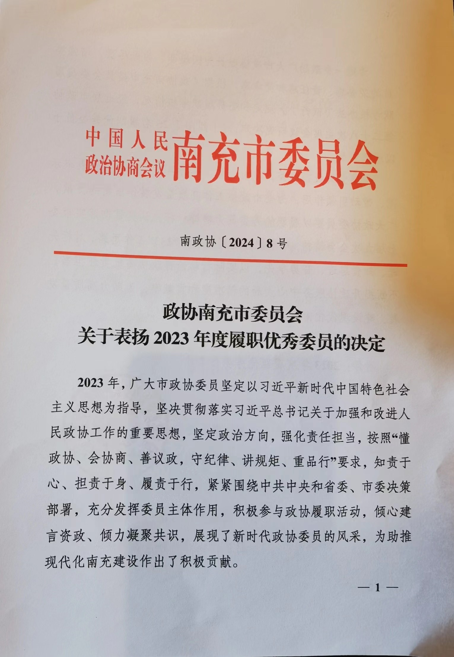 中國(guó)人民南充市委員會(huì)政治協(xié)商會(huì)議 南政協(xié)[2024]8號(hào)《政協(xié)南充市委員會(huì)關(guān)于表?yè)P(yáng)2023 年度職優(yōu)秀委員的決定》文件公布 我公司董事長(zhǎng)杜于斌被評(píng)為優(yōu)秀政協(xié)委員!這是一份至高無(wú)上的榮譽(yù),也是對(duì)他多年來(lái)為社會(huì)做出杰出貢獻(xiàn)的高度認(rèn)可。
