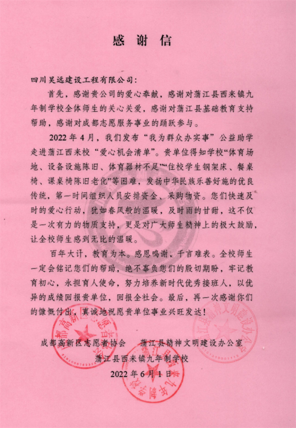 6月1日,四川昊遠(yuǎn)建設(shè)工程有限公司收到一封由蒲江縣精神文明建設(shè)辦公室、成都高新區(qū)志愿者協(xié)會、蒲江縣西來鎮(zhèn)九年制學(xué)校聯(lián)合發(fā)來的《感謝信》。這封熱情洋溢的感謝信,字里行間體現(xiàn)著蒲江縣精神文明建設(shè)辦公室、成都高新區(qū)志愿者協(xié)會、蒲江縣西來鎮(zhèn)九年制學(xué)校對公司主動作為、勇?lián)姑透视诜瞰I(xiàn)精神的崇高敬意,對公司捐贈行為給予了充分認(rèn)可和高度贊譽(yù)。